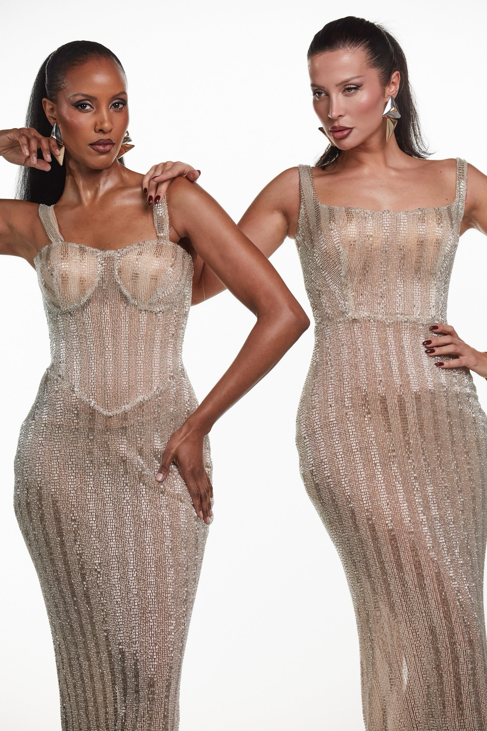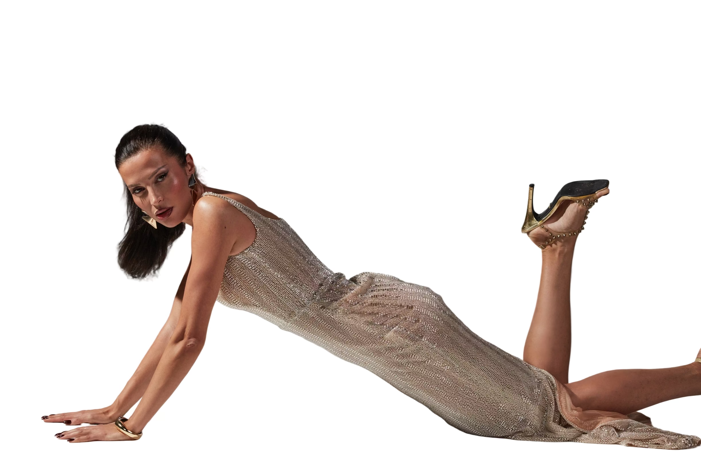 A tribute to late-90s metallic glamour, The Liquid Runway dress drapes the body in shimmering gold micro-mesh. With a subtle corset-inspired structure, the silhouette feels fluid yet controlled, made for the woman who embodies effortless radiance.