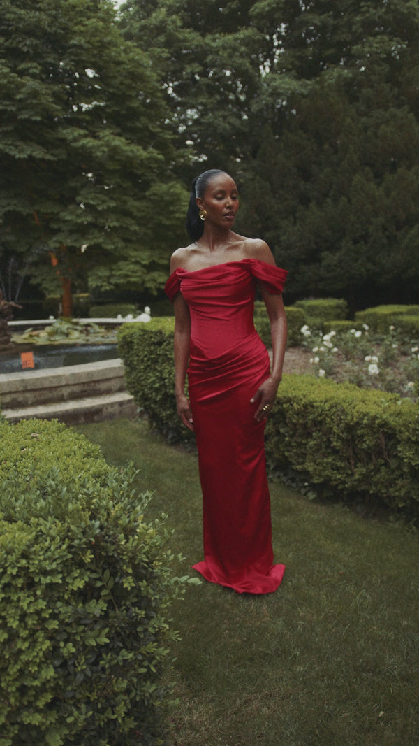 The Ruby Satin Off-Shoulder dress celebrates the bold yet refined beauty of the ruby stone and its elegance and enduring appeal. The soft draping at the neckline creates a romantic frame, while the rich crimson satin echoes ruby’s signature depth and clarity.